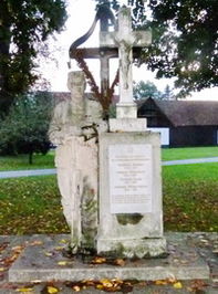 Quadratische Säule gekrönt mit Kruzifix, daneben Soldatenstatue am Dorfplatz.