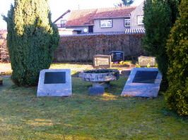 Auf dem Friedhof befinden sich links und rechts einer großen Blumenschale zwei Tafeln mit den Namen von Gefallenen der Endkämpfe des 2. Weltkrieges. Davor liegt eine einzelne kleine Metalltafel.