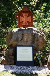 Neben der Dorfstraße mitten im Ort ein Findling, darauf ein hölzernes, überdachtes Tatzenkreuz. An