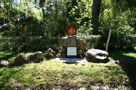 den Stein angelehnt eine Tafel mit Namen. Das Denkmal wurde offensichtlich im Zusammenhang mit dem 650-jährigen