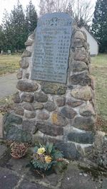 Denkmal für die Gefallenen des 1. Weltkriegs, Feldsteinpyramide mit eingelassener Namenstafel; Gedenktafel in der Kirche Flechtingen; Gedenken auf Familiengräbern