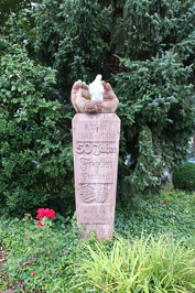 Hausach (Graf-Heinrich-Schule), Ortenaukreis, Baden-WürttembergPLZ 77756 An der Hauptstraße bei der Graf-Heinrich-Schule; nach unten zugespitzter Stein, vorne Inschriften, oben zwei geöffnete Hände und darin eine weiße Friedenstaube.