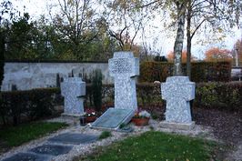 Im Friedhof drei Steinkreuze mit Spruch und Namen, davor eine liegende Metallplatte mit Namen