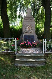 mit steinernem Tatzenkreuz. Auf der Vorderseite ein Vorbau mit einer Pieta, die einen sterbenden Krieger mit dem