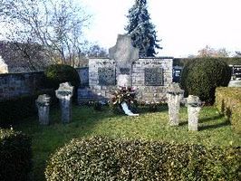 An einer Natursteinmauer sind zwei Namenstafeln aus Metall angebracht. Davor ein großes Steinkreuz, leicht seitlich versetzt vier kleine Steinkreuze.