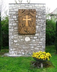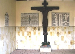 Denkmal: 1914 – 1918 1939 – 1945 UNS BLIEB NICHT WAHL ERLITTEN ALLE QUAL DIE NOT, DEN TOD DOCH MÖG AUS UNSRER HÄNDE OPFERSCHAL VON NEUEM WACHSEN AUFERSTEHUNGSMAL