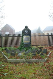 Auf dem Friedhof steht ein Gedenkstein mit Widmung. Davor liegen kleine Steinplatten mit den Namen der Gefallenen.