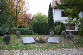 Bei der Kirche; drei Gedenkplatten am Boden, im Hintergrund Steinkreuze im Halbkreis; zusätzlich Hinweise zu Soldaten von privaten Gedenksteinen