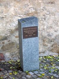Vor dem alten Friedhof steht eine Stele mit Messinggedenkplatte für den preußischen Generalfeldmarschall von Keith.