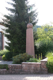 Bei der Kirche; mehreckige Säule, oben mit Kugel und Kreuz, vorne Bildrelief „Heiland“; zusätzlich Hinweise zu Soldaten von privaten Gedenksteinen