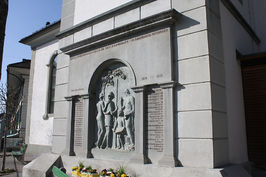 An der Kirche; a) am Glockenturm, in der Mitte Bildrelief, oben Inschrift und seitlich Namen; b) an der Seitenwand Gedenktafel