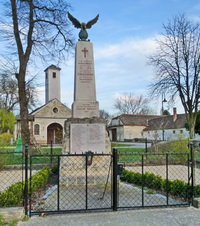 Stele auf Natursteinsockel gekrönt mit Adler und eingefriedet mit Metallgitterzaun neben der Kirche..