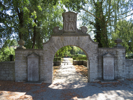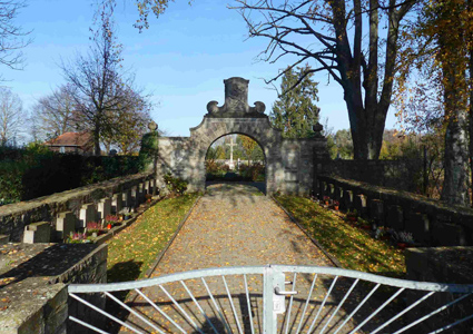 Ein Steintor bildet den Eingang zum Friedhof. Über dem Torbogen ist ein Bild des Heiligen Georg angebracht.