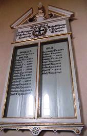Das Denkmal für die Gefallenen des 1. Weltkriegs verzeichnet keine Namen und auch in der Kirche ist