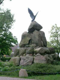 zu einer Pyramide aufgebaute Findlinge, auf der Spitze ein Adler mit ausgebreiteten Schwingen (ohne Namen); Gedenktafeln in