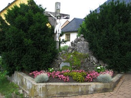 Kalteneggolsfeld, Stadt Heiligenstadt i.OFr., Landkreis Bamberg, Oberfranken, BayernPLZ 91332 Kleine Denkmalanlage mit Steinkreuz und Christusfigur sowie mit graviertem Naturstein im Dorfkern neben der Ortskapelle. Die Inschrift verzeichnet keine Namen.