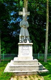 Soldatenstatue vor einem Steinkreuz auf mehrstufigen Sockel an der Kreuzung B6 – Hintausweg.