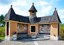 Rechtwinkeliges, holzschindelgedecktes Denkmal mit Glockenturm in der Mitte und Ecktürmen an beiden Enden dazwischen gemalte Kriegsszenen an den Verbindungswänden an der ehemaligen östl. Ortseinfahrt.