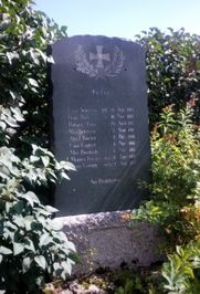 Aus Schiefer gearbeiteter einfacher Gedenkstein auf einem Sockel. Namen nach Todesdatum geordnet. Im oberen Teil ein Eisernes Kreuz von Lorbeer und Eichenzweig umwunden.