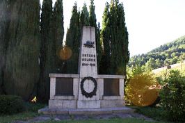 Im Friedhof: Säule, vorne oben Stahlhelm, darunter Lorbeerkranz, seitlich je eine Gedenktafel (1. Weltkrieg);