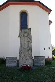 Säule mit Steinrelief „Heiland mit zwei knieenden Personen“, seitliche je eine Gedenktafel (2. Weltkrieg )