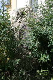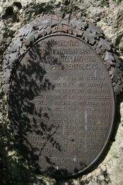 Ovale Metallplatte auf einem Findling neben dem Eingang zum Kirchhof, gegenwärtig durch Buschwerk weitgehend verdeckt. Daneben eine Jesusstatue.