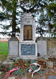 Rechteckige Säule mit Metallrelief gekrönt mit Adler flankiert von zwei Gedenktafeln neben der Kirche.