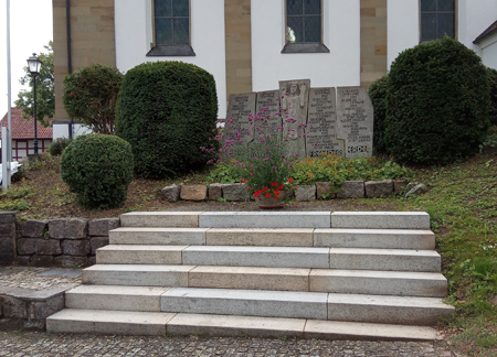 Kriegerdenkmal an der Kirche. Fünf Steinplatten, in der Mitte eine Figur.