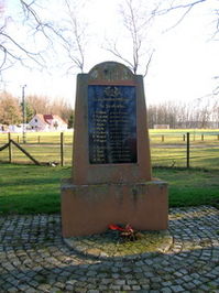 Vor dem Sportplatz: ca. 2,5 m hoher Gedenkstein mit Namensplatte
