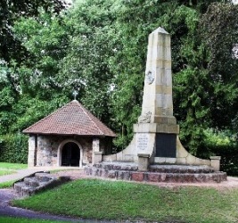 Obelisk zu Ehren der 78 Kriegstoten des Ersten Weltkrieges aus Knesebeck. Die Namen sind nach den vier
