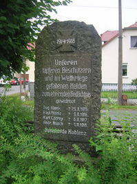 Koblenz (1. Weltkrieg), Gemeinde Lohsa, Landkreis Bautzen, SachsenPLZ 02999 In der Ortsmitte Koblenz steht in einer kleinen gepflegten Anlage der ca 1,8 m hohe Stein für die Opfer des Ortes im 1. Weltkrieg