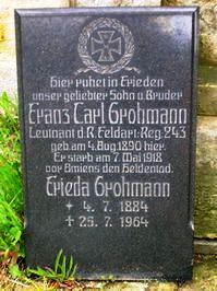 Hier ruhet in Frieden unser geliebter Sohn und Bruder Franz Carl Grohmann Leutnant d.R. Feldart. Reg. 243 geb. am 4.Aug. 1890 hier. Er starb am 7. Mai 1918 vor Amiens den Heldentod.
