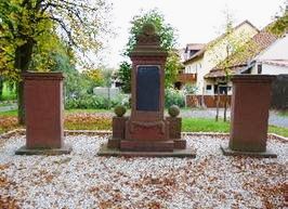 Stele aus Sandstein, oben zwei gekreuzte Kanonen mit Eichenlaub und Stahlhelm. Daneben zwei Gedenksteine aus Sandstein