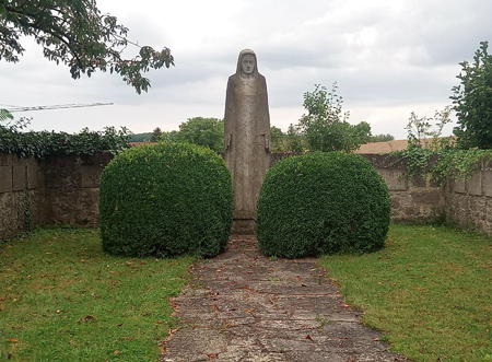 Im hinteren Teil mittig eine Steinfigur. Die Namensplatten aus Stein sind an drei Mauerseiten angebracht.