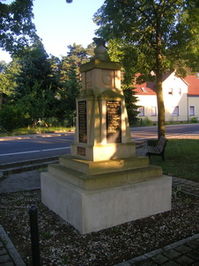 An der Hauptstraße steht das Denkmal, hochquadratisch, oben mit Adler.