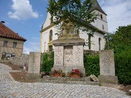 Vor der Kirche drei Gedenksteine. Der mittlere mit einer Sterbeszene, sowie im unteren Teil mit einem Stahlhelm auf Seitengewehr, Granate und Lorbeerrästen.