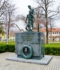 Auf einem Quader aus schwarzen Marmor am Stiftungsplatz stehen die Bronzefiguren zweier fast nackter Männer und auf der Frontseite des Quaders hängt, ebenfalls aus Bronze, ein Lorbeerkranz.