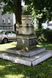 Urne auf einem quadratischem Sockel, hieran zwei Tafeln mit den Namen der Opfer des 1. Weltkrieges sowie eine für die des 2. Weltkrieges.