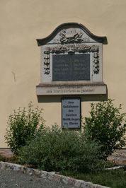 Wandplakette für die Opfer des 1. Weltkrieges an der evangelischen Kirche, darunter Gedenktafel ohne Namen für die des 2. Weltkrieges