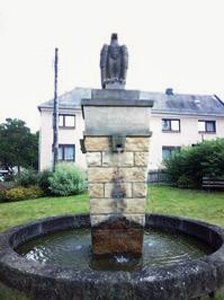 Denkmal-Nr.: 09231976 Aus Buckelquadern gemauerte, sich nach unten verjüngende Stele in einem Brunnenrund auf einer Grünanlage. Ursprünglich war dort noch ein Springbrunnen. Aus der Vorderseite fließt Wasser. Darauf ein Block, der an den Seiten, vorn und hinten eine Inschrift trägt. An der linken und rechten Seite die Namen der Toten des 1. Weltkrieges. Abgeschlossen wird das Denkmal von einem sitzenden Adler. Vor den Brunnen wurde eine Tafel mit einer Inschrift für die Zeit 1939-1945 gelegt (ohne Namen).
