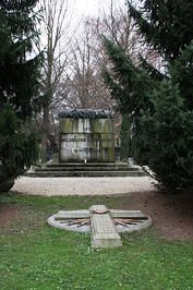 Im Friedhof St. Barbara: zwei Reihen Bodenplatten in Form eines Walmdaches, seitlich Namen, an den Stirnseiten zum Teil Namen oder andere Texte, am oberen Ende ein Betonkreuz mit Strahlenkranz am Boden. Dahinter die Säulen (siehe separater Beitrag)