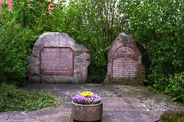 Bei der Kirche: zwei Natursteine mit Gedenktafeln; zusätzlich Hinweise zu Soldaten von privaten Gedenksteinen