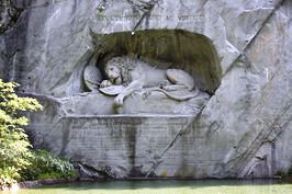 Im Zentrum von Luzern, in der Grotte an einer Felswand eine Steinplastik eines sterbenden Löwen, darüber und