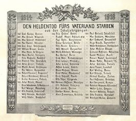 Quellen: Merseburger Korrespondent Nr. 137 vom 26.06.1920 und Festschrift zur Erinnerung an das fünfzigjährige Bestehen der Schule 1869-1919. Von Direktor Dr. Orphal, Leipzig: J. Klinkhardt, (1920) in Ranneberg, Marion. Über die Errichtung von Gedenkzeichen für die Gefallenen des Weltkrieges 1914 1918 in der Stadt Merseburg. Merseburger Kreiskalender 2016. Landkreis Saalekreis: Kulturhistorisches Museum Schloss Merseburg S. 49/50