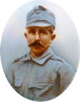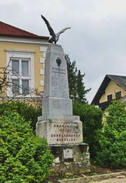 Stele auf Natursteinsockel gekrönt mit Adler am Dorfplatz.