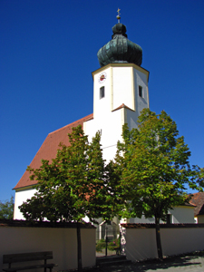 Steindenkmal mit krönendem Tatzenkreuz an der Außenwand der Kirche St. Hippolyt.