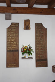 In der Kirche: zwei Holztafel und dazwischen ein Christusbildnis. Auf dem Friedhof: ein Soldatengrab und zusätzlich Hinweise zu Soldaten von privaten Gedenksteinen