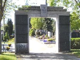 Steintor. An den Säulen sind Gedenkplatten angebracht. Rechts und links davor auf einer Grünfläche sind einzelne Gedenksteine aufgestellt.