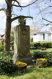 Im alten Friedhof von Müllheim eine quadratische Säule; oben ein Eisernes Kreuz, Inschriften vorne und hinten,