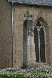 Obelisk mit aufgesetztem Eisernen Kreuz aus Stein vor der evangelischen St. Mauritiuskirche. Verwitterungen im Schriftbereich. Beschriftungen an den Seiten wurden offensichtlich unleserlich gemacht (herausgemeißelt), wie auch die unteren zwei Zeilen an der Vorderseite.
